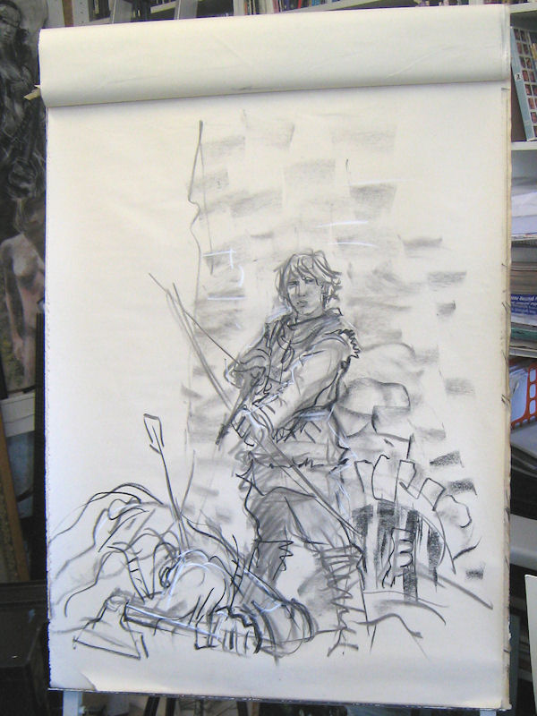 Après quelques essais, le dessinateur s’est finalement tourné vers une scène où Thorgal est plus à son avantage. Il se dresse seul face aux mercenaires qui veulent l’abattre, au pied d’une tour délabrée. Un homme mort montre sa détermination, et une main tenant les barreaux indique qu’une personne est enfermée derrière lui.