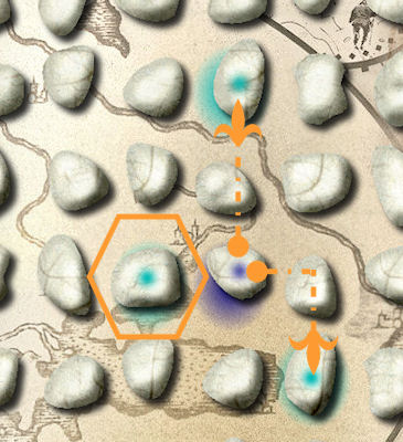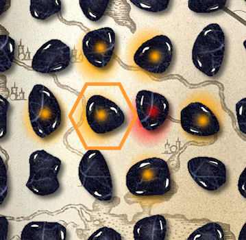 – Si aucun joueur n’a trouvé la bonne pierre, il y a d’abord priorité à la couleur, puis le vainqueur est le joueur dont la pierre est la plus proche de la pierre exacte. Les distances sont calculées de gauche à droite et de haut en bas, pas en diagonale. Dans l’exemple ci-dessous, la pierre gagnante la plus proche est celle de gauche (1 case d’écart), les deux autres étant à deux cases d’écart.