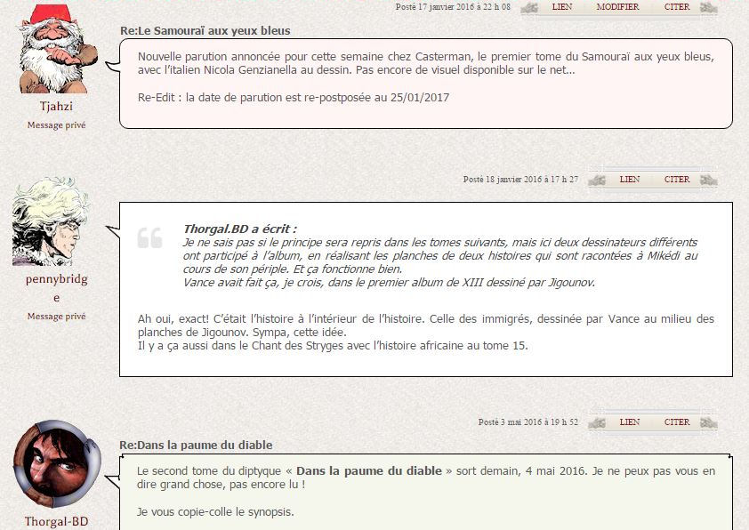 Un problème qui avait déjà été signalé, c’est le premier message débutant une nouvelle page qui ne s’affiche pas quand on clique sur le sujet. La nouvelle page n’est d’ailleurs pas indiquée. Je viens de le revivre avec ce sujet-ci qui est resté affiché avec 4 pages alors que mon nouveau message arrive en page 5 : http://www.thorgal.com/sujet/parutions-futures-2013-2017/
