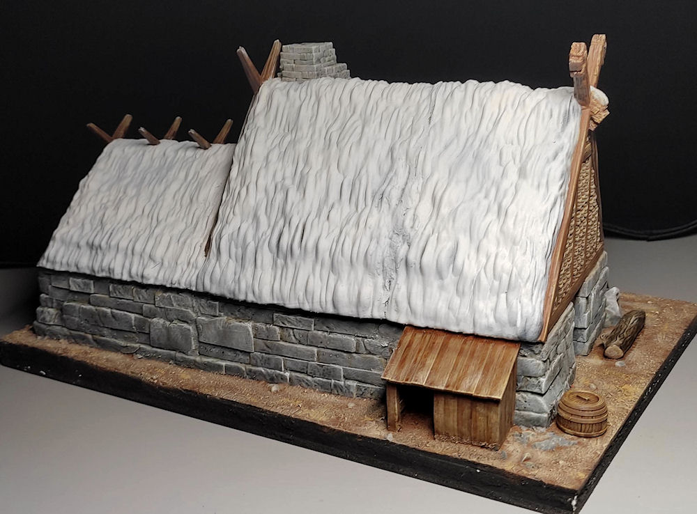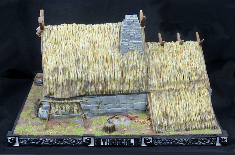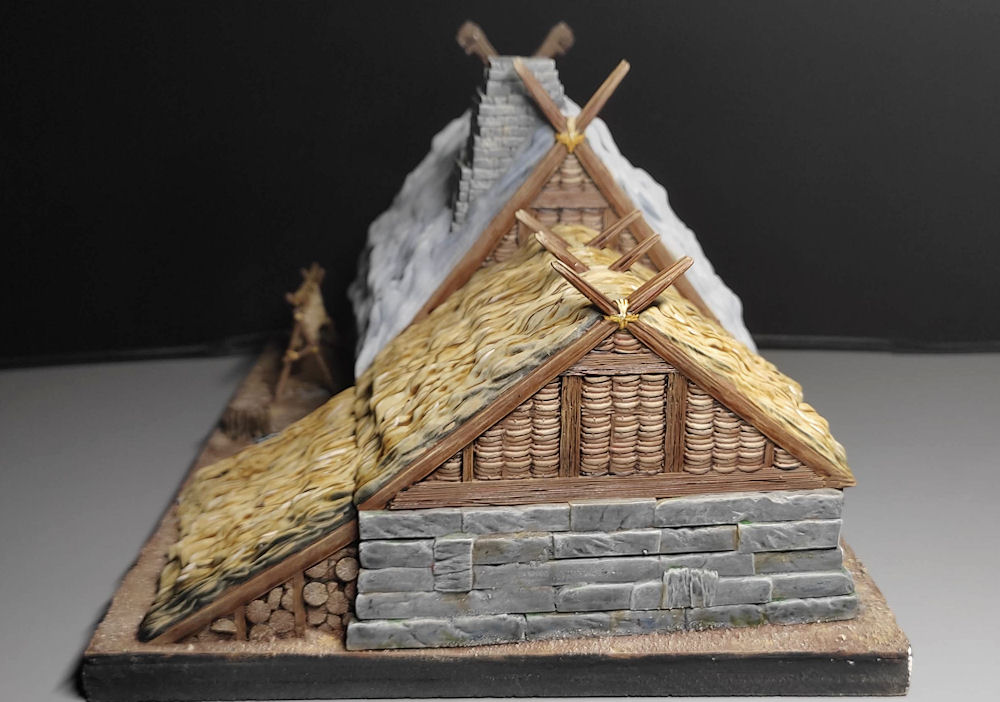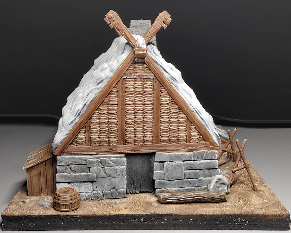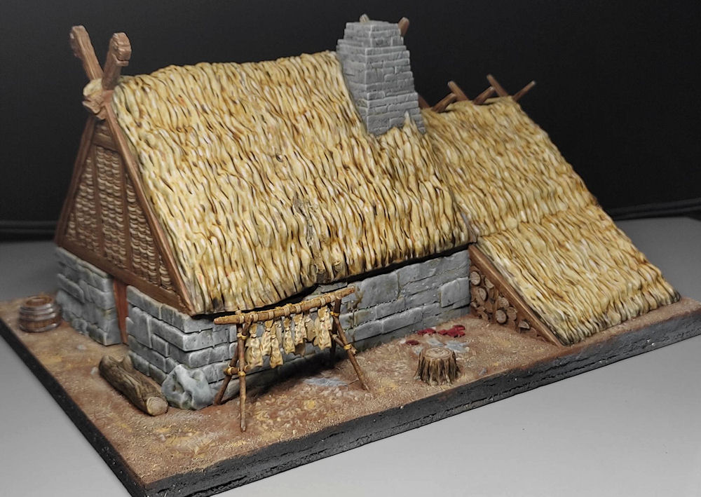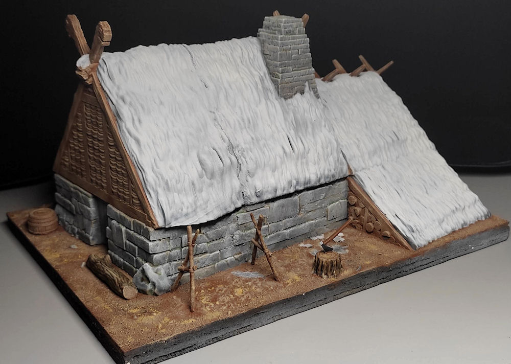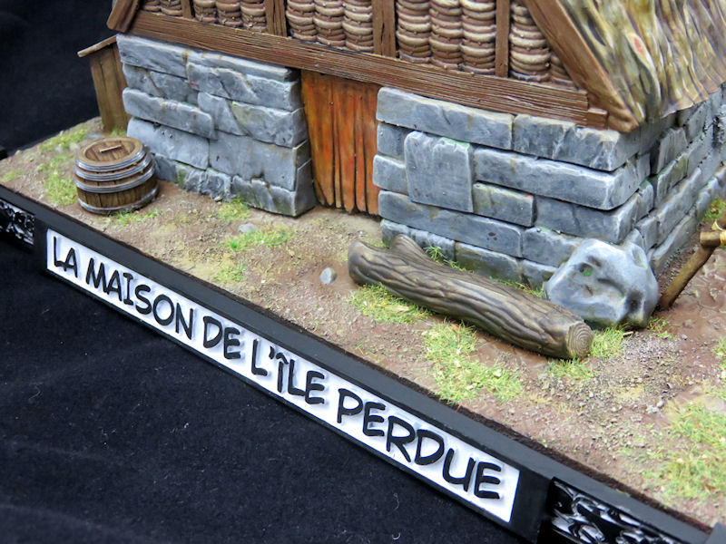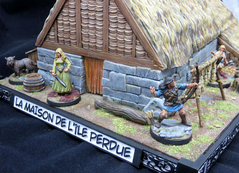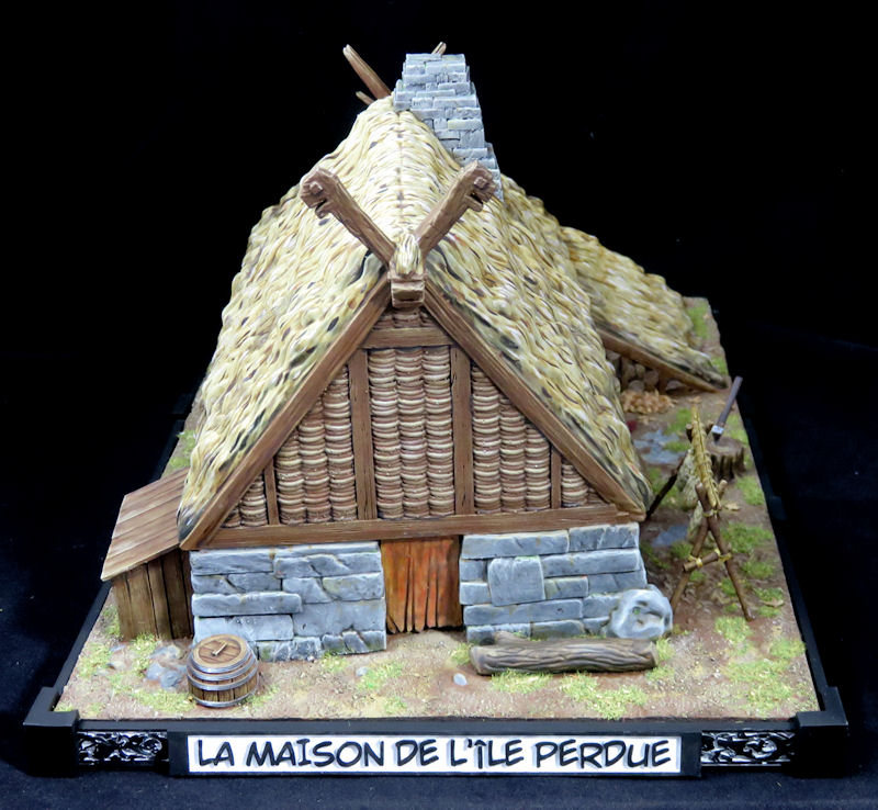 Avec l’automne, les choses vont s’améliorer. Je trouve le profil assez sympa.  je ne cherche pas à me rapprocher d’un rendu réaliste, j’ai des teintes spécifiques en tête (comme pour les figurines) et ça va continuer avec les prochaines scénettes que j’ai envie de réaliser. En attendant, j’avance doucement mais pas trop mal sur la réalisation du cadre de socle.  A droite les morceaux simplement sous-couchés, à gauche les interstices peints en blanc, au milieu un élément finalisé, pour le plaisir d’en faire un (et pour se dire : allez, plus que cinq… ).   C’est quoi l’élément customisé dont tu parles ? tout est customisé non ? les textures sont très belles, c’est chouette. Sur le Facebook polonais j’ai vu passer une gardienne des clés avec la porte de l’Entre-monde, réalisés en 3D et non peint, avec un socle rond, mais c’est plus gros je pense. thorgal-bdWebmestre La maison de l'île perdue – Partie 14Merci Hirondl. C’était une blaguounette ! Histoire de me fustiger un peu. J’ai customisé la hache en la cassant pour la deuxième ou troisième fois. A chaque fois je recolle en me disant que je vais faire très attention et que ça ne recommencera pas. Jusqu’à la prochaine ?  J’ai commencé à travailler sur une gardienne des clés faite maison mais ce sera pour dans quelques temps…   LA MAISON DE L’ÎLE PERDUE J’ai terminé les grandes étendues de paille. Ce fut très long ! Des centaines de petits traits de cinq couleurs différentes.  Un petit zoom.  Je vais continuer à travailler les textures, les ombrages. Pas facile d’arbitrer maintenant, je ne veux pas en faire trop.  Mon objectif est de mêler rendu naturel et rendu BD, avec donc des nuances mais aussi des zones relativement tranchées.  Avec le recul, j’aurais sûrement dû partir sur une pierre moins grise, plus brune. Mais ça restera comme ça ! Je vais ajouter de la verdure, je pense que l’ensemble sera plus harmonieux (il y aura moins de marron). Là les couleurs chaudes dominent trop.  J’ai assombri la base du toit pour qu’il s’intègre bien à l’ensemble.  J’en suis content de ma maison !  En attendant vos retours, j’attaque le gros chantier du socle. Que du noir et du blanc, mais beaucoup, et long. Je pense pouvoir l’annoncer : mon prochain message devrait présenter la maison terminée !   bah dis-donc qu’est-ce que c’est chouette ! En effet il manque un peu de vert, de l’herbe, et des mousses notamment, côté nord. Mais bravo, elle est très jolie cette maison. Voir l’évolution du travail de peinture est interessant aussi. thorgal-bdWebmestre La maison de l'île perdue – Partie 15Merci Hirondl. J’espère que les photos ci-dessous répondront à ton besoin de verdure, que je partage !   LA MAISON DE L’ÎLE PERDUE  Après tous ces mois d’efforts, j’ai la grande joie de vous présenter enfin la maison de la famille Aegirsson ! Trop content ! Tellement, tellement !  C’est l’un des plus chouettes projets de modélisme que j’ai réalisés ces dernières années. Chaque moment a été sympa, de la modélisation 3D numérique jusqu’au montage final du cadre du socle, avec toutes ces décos typiquement thorgaliennes. La scénette mesure 21 par 29 centimètres au sol, et 15 centimètres de haut (socle inclus).  J’ai essayé de placer différents détails sur ce profil notamment, avec des éléments de la vie de tous les jours, comme ce séchoir à poissons typiquement scandinave ou cette hache plantée dans une souche d’arbre comme on le voit dans les albums. Il y a aussi quelques tomettes rouges en clin d’œil, référence à celles qui sont placées sur différents socles des figurines du jeu polonais.  L’arrière de la maison est moins vivant mais j’ai essayé d’utiliser au mieux chaque centimètre disponible, pour qu’il soit possible de l’imprimer en seulement trois morceaux.  Pour l’autre côté, j’ai hésité puisque j’avais un peu de place derrière le cabanon. Finalement, je me suis contenté de déposer des feuilles d’arbre pour le moment. J’aurais pu appuyer quelques outils ou quelques planches contre le mur. Peut-être plus tard ? Je trouve que c’est plutôt joli quand même.  Le cabanon restera vide. Je ne sais pas ce que Grzegorz voulait en faire alors je préfère ne pas lui donner d’usage marquant.  Sur la façade, on retrouve des éléments de vie quotidienne. En plus du cabanon, on a une réserve d’eau et un banc. Et cette tenture qui invite à entrer pour rejoindre la famille.  J’ai adoré partager ce projet avec vous pendant ces mois passés à le peaufiner. J’espère que la maison vous plaira.  J’ai pris des gros plans et placé quelques figurines dans la scénette, je vous montre tout ça au plus vite, avant de repartir sur un nouveau projet  . .Le résultat est incroyable !  Félicitations !! Tu vas rendre jaloux les fans de Thorgal qui voudraient aussi admirer cette maison chez eux ! Je suis curieuse de la découvrir entourée des personnages de la saga…. Félicitations !! Tu vas rendre jaloux les fans de Thorgal qui voudraient aussi admirer cette maison chez eux ! Je suis curieuse de la découvrir entourée des personnages de la saga….Bravo, c’est magnifique, bravo pour le long travail et pour le résultat. Parfois certains choses demandent énormément de travail, pour un résultat pas forcément à la hauteur de l’effort. Il faut toujours que le résultat soit admiré pour lui-même, par pour l’effort fastidieux qu’il a nécessité. Et là c’est le cas, la maison est trop jolie. thorgal-bdWebmestre La maison de l'île perdue – Partie 16Merci beaucoup à toutes les trois, vos messages font très plaisir ! Comme promis, voici quelques plans plus resserrés et une mise en situation avec des figurines, que je laisse dans la scénette pour la mise en vitrine. LA MAISON DE L’ÎLE PERDUE       La fameuse hache, que j’ai cassée et réparé