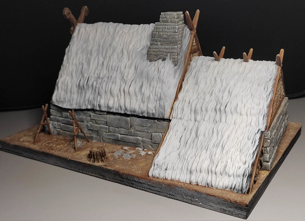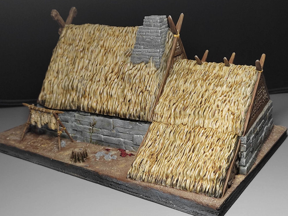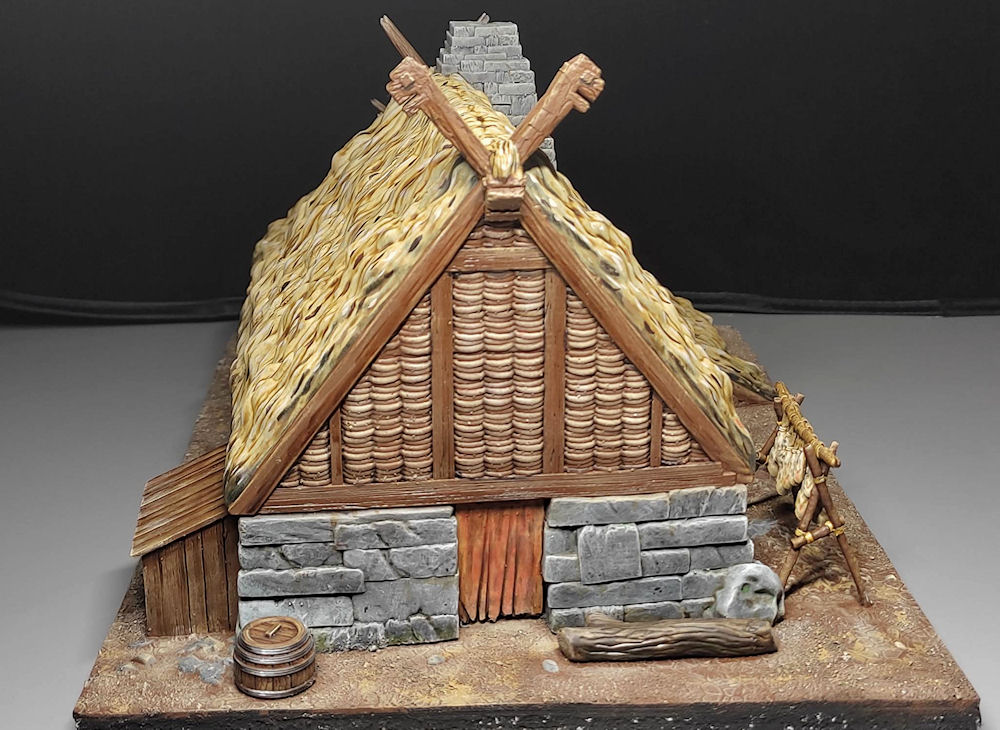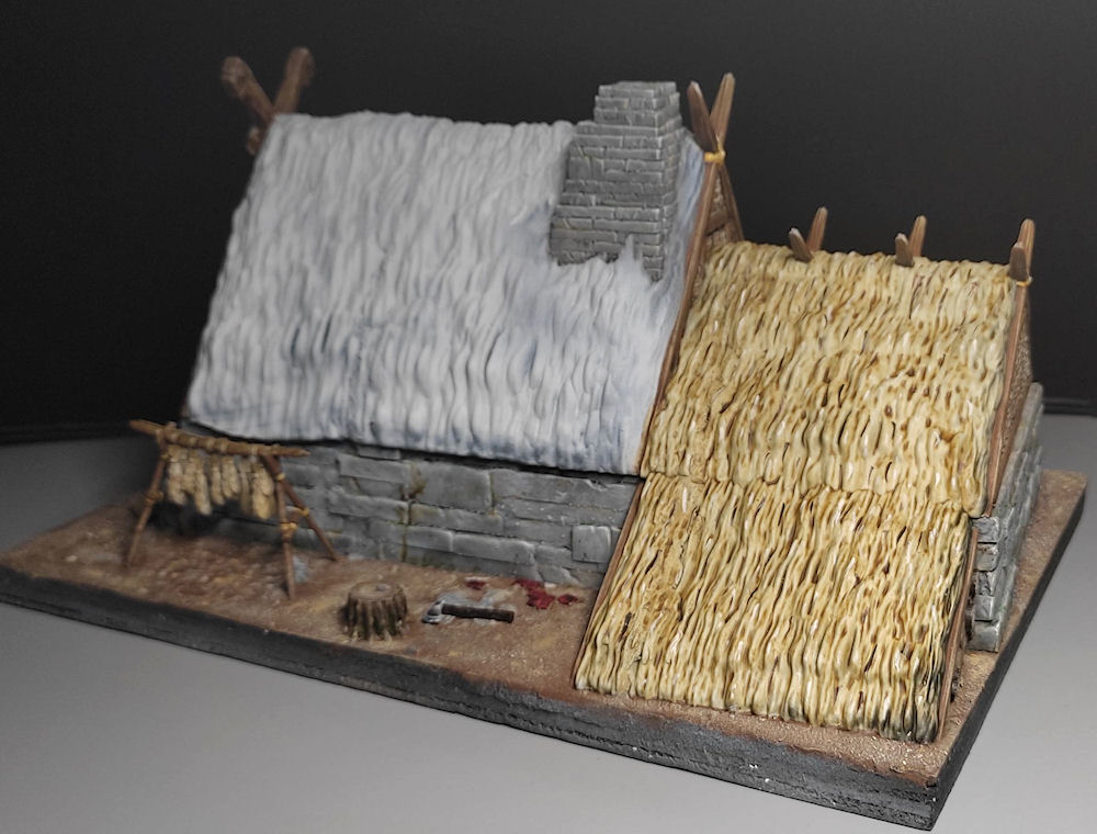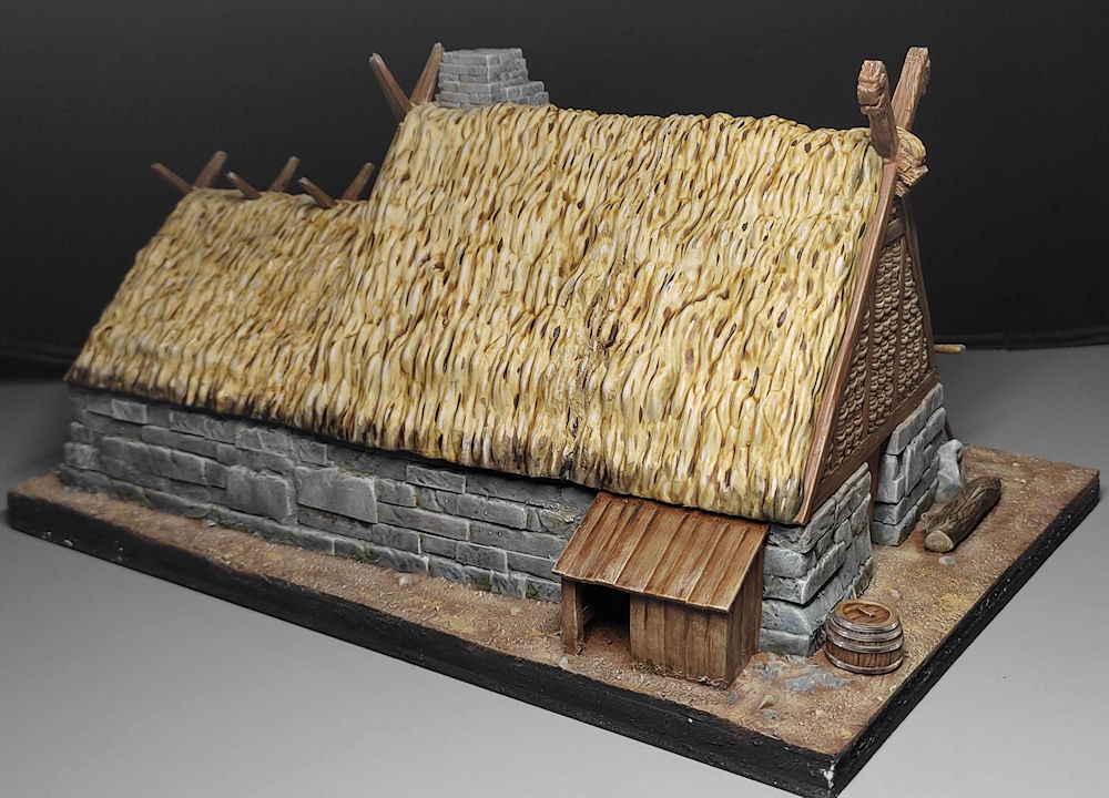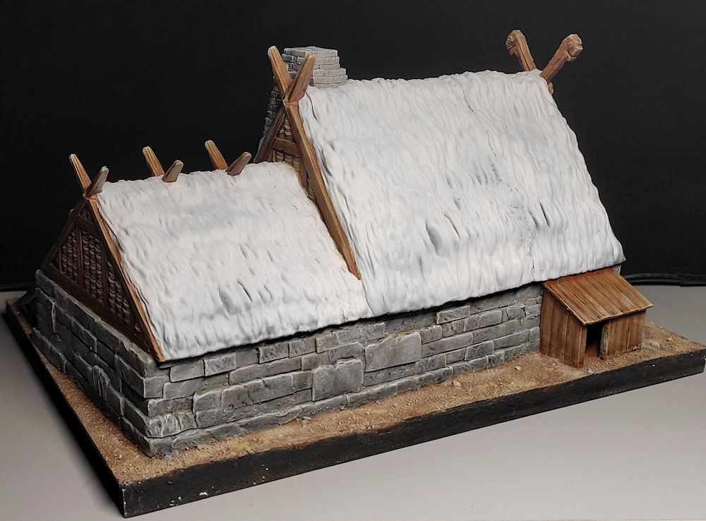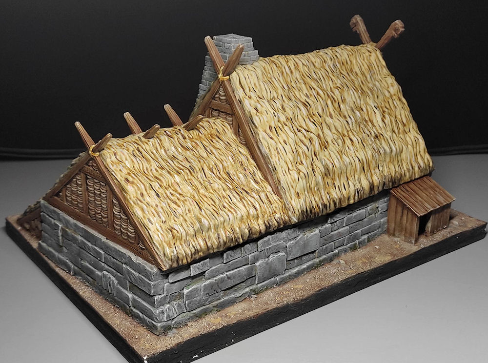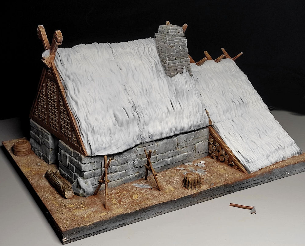 Avec l’automne, les choses vont s’améliorer. Je trouve le profil assez sympa.  je ne cherche pas à me rapprocher d’un rendu réaliste, j’ai des teintes spécifiques en tête (comme pour les figurines) et ça va continuer avec les prochaines scénettes que j’ai envie de réaliser. En attendant, j’avance doucement mais pas trop mal sur la réalisation du cadre de socle.  A droite les morceaux simplement sous-couchés, à gauche les interstices peints en blanc, au milieu un élément finalisé, pour le plaisir d’en faire un (et pour se dire : allez, plus que cinq… ).   C’est quoi l’élément customisé dont tu parles ? tout est customisé non ? les textures sont très belles, c’est chouette. Sur le Facebook polonais j’ai vu passer une gardienne des clés avec la porte de l’Entre-monde, réalisés en 3D et non peint, avec un socle rond, mais c’est plus gros je pense. thorgal-bdWebmestre La maison de l'île perdue – Partie 14Merci Hirondl. C’était une blaguounette ! Histoire de me fustiger un peu. J’ai customisé la hache en la cassant pour la deuxième ou troisième fois. A chaque fois je recolle en me disant que je vais faire très attention et que ça ne recommencera pas. Jusqu’à la prochaine ?  J’ai commencé à travailler sur une gardienne des clés faite maison mais ce sera pour dans quelques temps…   LA MAISON DE L’ÎLE PERDUE J’ai terminé les grandes étendues de paille. Ce fut très long ! Des centaines de petits traits de cinq couleurs différentes.  Un petit zoom.  Je vais continuer à travailler les textures, les ombrages. Pas facile d’arbitrer maintenant, je ne veux pas en faire trop.  Mon objectif est de mêler rendu naturel et rendu BD, avec donc des nuances mais aussi des zones relativement tranchées.  Avec le recul, j’aurais sûrement dû partir sur une pierre moins grise, plus brune. Mais ça restera comme ça ! Je vais ajouter de la verdure, je pense que l’ensemble sera plus harmonieux (il y aura moins de marron). Là les couleurs chaudes dominent trop.  J’ai assombri la base du toit pour qu’il s’intègre bien à l’ensemble.  J’en suis content de ma maison !  En attendant vos retours, j’attaque le gros chantier du socle. Que du noir et du blanc, mais beaucoup, et long. Je pense pouvoir l’annoncer : mon prochain message devrait présenter la maison terminée !   bah dis-donc qu’est-ce que c’est chouette ! En effet il manque un peu de vert, de l’herbe, et des mousses notamment, côté nord. Mais bravo, elle est très jolie cette maison. Voir l’évolution du travail de peinture est interessant aussi. thorgal-bdWebmestre La maison de l'île perdue – Partie 15Merci Hirondl. J’espère que les photos ci-dessous répondront à ton besoin de verdure, que je partage !   LA MAISON DE L’ÎLE PERDUE  Après tous ces mois d’efforts, j’ai la grande joie de vous présenter enfin la maison de la famille Aegirsson ! Trop content ! Tellement, tellement !  C’est l’un des plus chouettes projets de modélisme que j’ai réalisés ces dernières années. Chaque moment a été sympa, de la modélisation 3D numérique jusqu’au montage final du cadre du socle, avec toutes ces décos typiquement thorgaliennes. La scénette mesure 21 par 29 centimètres au sol, et 15 centimètres de haut (socle inclus).  J’ai essayé de placer différents détails sur ce profil notamment, avec des éléments de la vie de tous les jours, comme ce séchoir à poissons typiquement scandinave ou cette hache plantée dans une souche d’arbre comme on le voit dans les albums. Il y a aussi quelques tomettes rouges en clin d’œil, référence à celles qui sont placées sur différents socles des figurines du jeu polonais.  L’arrière de la maison est moins vivant mais j’ai essayé d’utiliser au mieux chaque centimètre disponible, pour qu’il soit possible de l’imprimer en seulement trois morceaux.  Pour l’autre côté, j’ai hésité puisque j’avais un peu de place derrière le cabanon. Finalement, je me suis contenté de déposer des feuilles d’arbre pour le moment. J’aurais pu appuyer quelques outils ou quelques planches contre le mur. Peut-être plus tard ? Je trouve que c’est plutôt joli quand même.  Le cabanon restera vide. Je ne sais pas ce que Grzegorz voulait en faire alors je préfère ne pas lui donner d’usage marquant.  Sur la façade, on retrouve des éléments de vie quotidienne. En plus du cabanon, on a une réserve d’eau et un banc. Et cette tenture qui invite à entrer pour rejoindre la famille.  J’ai adoré partager ce projet avec vous pendant ces mois passés à le peaufiner. J’espère que la maison vous plaira.  J’ai pris des gros plans et placé quelques figurines dans la scénette, je vous montre tout ça au plus vite, avant de repartir sur un nouveau projet  . .Le résultat est incroyable !  Félicitations !! Tu vas rendre jaloux les fans de Thorgal qui voudraient aussi admirer cette maison chez eux ! Je suis curieuse de la découvrir entourée des personnages de la saga…. Félicitations !! Tu vas rendre jaloux les fans de Thorgal qui voudraient aussi admirer cette maison chez eux ! Je suis curieuse de la découvrir entourée des personnages de la saga….Bravo, c’est magnifique, bravo pour le long travail et pour le résultat. Parfois certains choses demandent énormément de travail, pour un résultat pas forcément à la hauteur de l’effort. Il faut toujours que le résultat soit admiré pour lui-même, par pour l’effort fastidieux qu’il a nécessité. Et là c’est le cas, la maison est trop jolie. thorgal-bdWebmestre La maison de l'île perdue – Partie 16Merci beaucoup à toutes les trois, vos messages font très plaisir ! Comme promis, voici quelques plans plus resserrés et une mise en situation avec des figurines, que je laisse dans la scénette pour la mise en vitrine. LA MAISON DE L’ÎLE PERDUE       La fameuse hache, que j’ai cassée et réparé