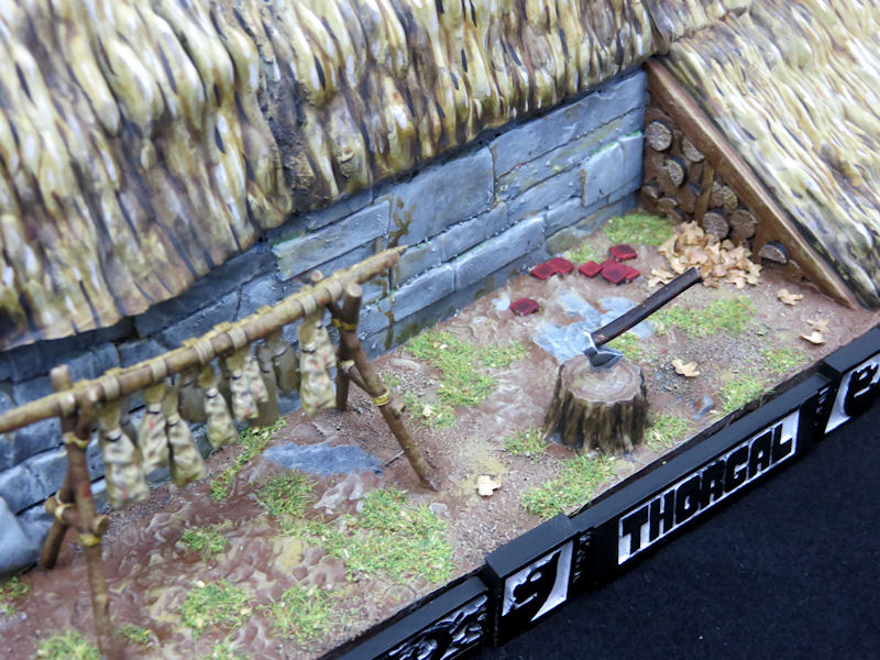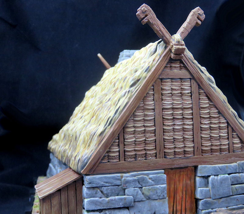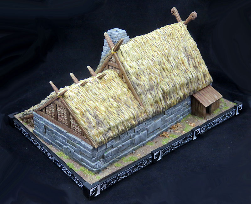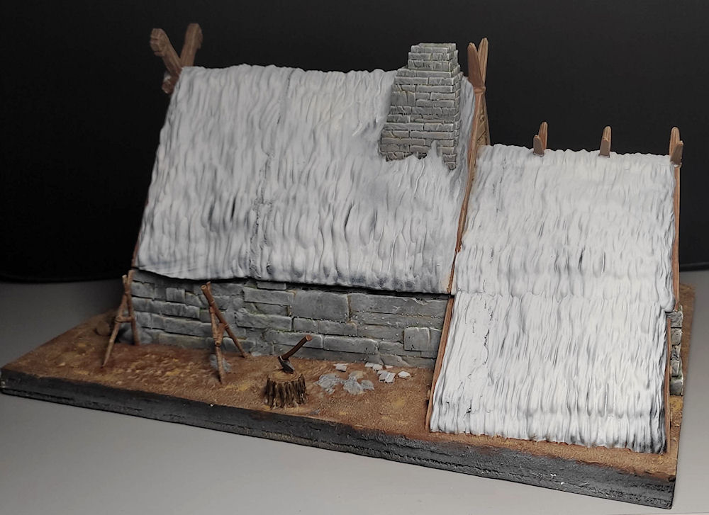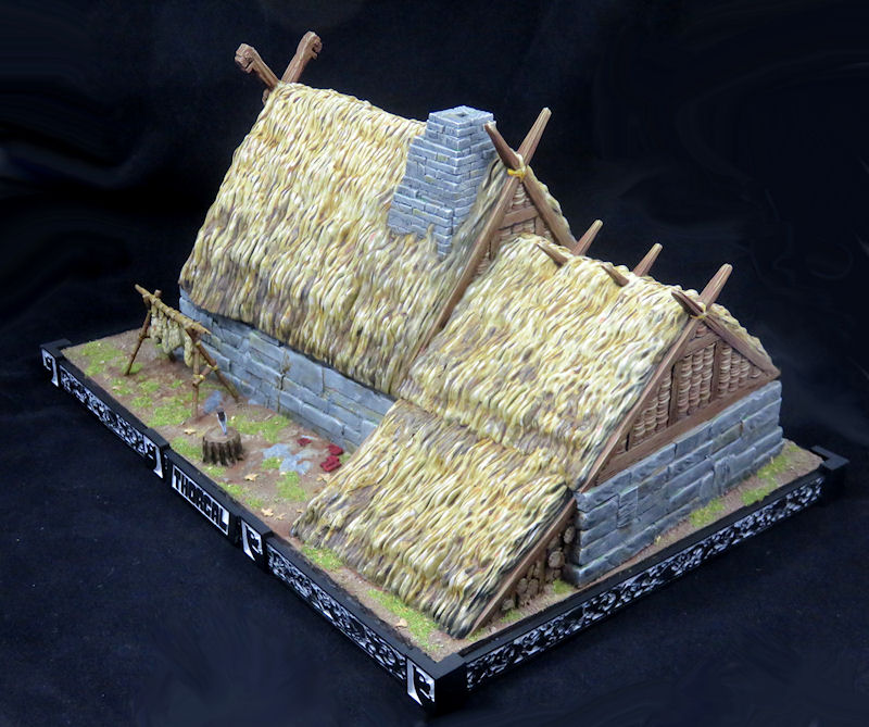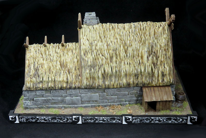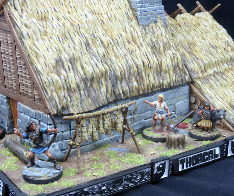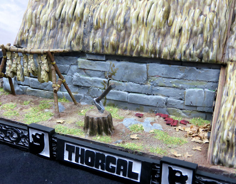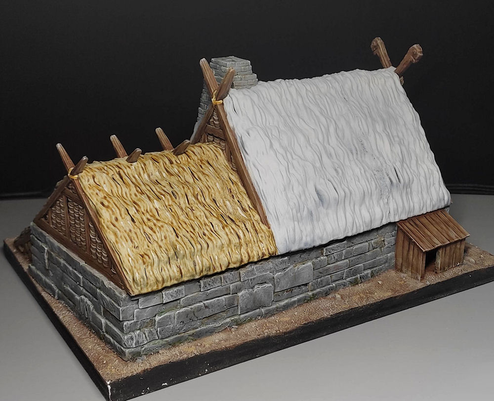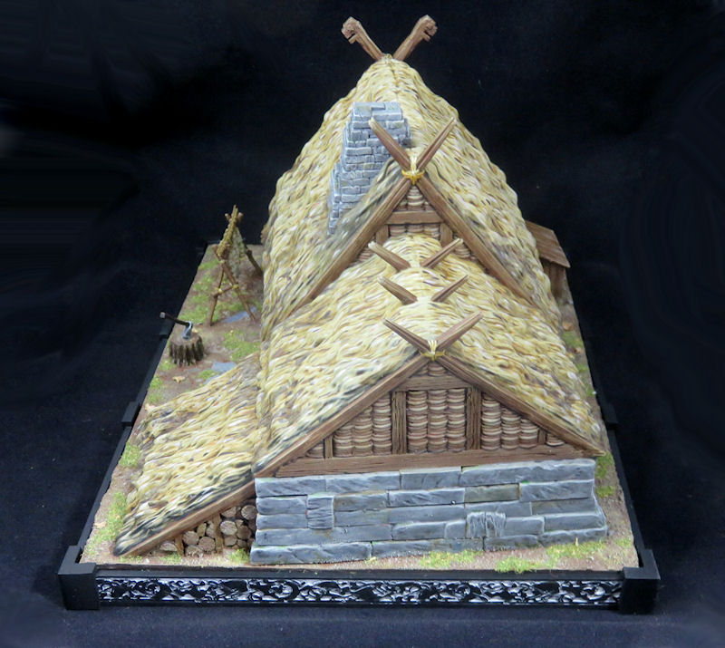 Avec l’automne, les choses vont s’améliorer. Je trouve le profil assez sympa.  je ne cherche pas à me rapprocher d’un rendu réaliste, j’ai des teintes spécifiques en tête (comme pour les figurines) et ça va continuer avec les prochaines scénettes que j’ai envie de réaliser. En attendant, j’avance doucement mais pas trop mal sur la réalisation du cadre de socle.  A droite les morceaux simplement sous-couchés, à gauche les interstices peints en blanc, au milieu un élément finalisé, pour le plaisir d’en faire un (et pour se dire : allez, plus que cinq… ).   C’est quoi l’élément customisé dont tu parles ? tout est customisé non ? les textures sont très belles, c’est chouette. Sur le Facebook polonais j’ai vu passer une gardienne des clés avec la porte de l’Entre-monde, réalisés en 3D et non peint, avec un socle rond, mais c’est plus gros je pense. thorgal-bdWebmestre La maison de l'île perdue – Partie 14Merci Hirondl. C’était une blaguounette ! Histoire de me fustiger un peu. J’ai customisé la hache en la cassant pour la deuxième ou troisième fois. A chaque fois je recolle en me disant que je vais faire très attention et que ça ne recommencera pas. Jusqu’à la prochaine ?  J’ai commencé à travailler sur une gardienne des clés faite maison mais ce sera pour dans quelques temps…   LA MAISON DE L’ÎLE PERDUE J’ai terminé les grandes étendues de paille. Ce fut très long ! Des centaines de petits traits de cinq couleurs différentes.  Un petit zoom.  Je vais continuer à travailler les textures, les ombrages. Pas facile d’arbitrer maintenant, je ne veux pas en faire trop.  Mon objectif est de mêler rendu naturel et rendu BD, avec donc des nuances mais aussi des zones relativement tranchées.  Avec le recul, j’aurais sûrement dû partir sur une pierre moins grise, plus brune. Mais ça restera comme ça ! Je vais ajouter de la verdure, je pense que l’ensemble sera plus harmonieux (il y aura moins de marron). Là les couleurs chaudes dominent trop.  J’ai assombri la base du toit pour qu’il s’intègre bien à l’ensemble.  J’en suis content de ma maison !  En attendant vos retours, j’attaque le gros chantier du socle. Que du noir et du blanc, mais beaucoup, et long. Je pense pouvoir l’annoncer : mon prochain message devrait présenter la maison terminée !   bah dis-donc qu’est-ce que c’est chouette ! En effet il manque un peu de vert, de l’herbe, et des mousses notamment, côté nord. Mais bravo, elle est très jolie cette maison. Voir l’évolution du travail de peinture est interessant aussi. thorgal-bdWebmestre La maison de l'île perdue – Partie 15Merci Hirondl. J’espère que les photos ci-dessous répondront à ton besoin de verdure, que je partage !   LA MAISON DE L’ÎLE PERDUE  Après tous ces mois d’efforts, j’ai la grande joie de vous présenter enfin la maison de la famille Aegirsson ! Trop content ! Tellement, tellement !  C’est l’un des plus chouettes projets de modélisme que j’ai réalisés ces dernières années. Chaque moment a été sympa, de la modélisation 3D numérique jusqu’au montage final du cadre du socle, avec toutes ces décos typiquement thorgaliennes. La scénette mesure 21 par 29 centimètres au sol, et 15 centimètres de haut (socle inclus).  J’ai essayé de placer différents détails sur ce profil notamment, avec des éléments de la vie de tous les jours, comme ce séchoir à poissons typiquement scandinave ou cette hache plantée dans une souche d’arbre comme on le voit dans les albums. Il y a aussi quelques tomettes rouges en clin d’œil, référence à celles qui sont placées sur différents socles des figurines du jeu polonais.  L’arrière de la maison est moins vivant mais j’ai essayé d’utiliser au mieux chaque centimètre disponible, pour qu’il soit possible de l’imprimer en seulement trois morceaux.  Pour l’autre côté, j’ai hésité puisque j’avais un peu de place derrière le cabanon. Finalement, je me suis contenté de déposer des feuilles d’arbre pour le moment. J’aurais pu appuyer quelques outils ou quelques planches contre le mur. Peut-être plus tard ? Je trouve que c’est plutôt joli quand même.  Le cabanon restera vide. Je ne sais pas ce que Grzegorz voulait en faire alors je préfère ne pas lui donner d’usage marquant.  Sur la façade, on retrouve des éléments de vie quotidienne. En plus du cabanon, on a une réserve d’eau et un banc. Et cette tenture qui invite à entrer pour rejoindre la famille.  J’ai adoré partager ce projet avec vous pendant ces mois passés à le peaufiner. J’espère que la maison vous plaira.  J’ai pris des gros plans et placé quelques figurines dans la scénette, je vous montre tout ça au plus vite, avant de repartir sur un nouveau projet  . .Le résultat est incroyable !  Félicitations !! Tu vas rendre jaloux les fans de Thorgal qui voudraient aussi admirer cette maison chez eux ! Je suis curieuse de la découvrir entourée des personnages de la saga…. Félicitations !! Tu vas rendre jaloux les fans de Thorgal qui voudraient aussi admirer cette maison chez eux ! Je suis curieuse de la découvrir entourée des personnages de la saga….Bravo, c’est magnifique, bravo pour le long travail et pour le résultat. Parfois certains choses demandent énormément de travail, pour un résultat pas forcément à la hauteur de l’effort. Il faut toujours que le résultat soit admiré pour lui-même, par pour l’effort fastidieux qu’il a nécessité. Et là c’est le cas, la maison est trop jolie. thorgal-bdWebmestre La maison de l'île perdue – Partie 16Merci beaucoup à toutes les trois, vos messages font très plaisir ! Comme promis, voici quelques plans plus resserrés et une mise en situation avec des figurines, que je laisse dans la scénette pour la mise en vitrine. LA MAISON DE L’ÎLE PERDUE       La fameuse hache, que j’ai cassée et réparé