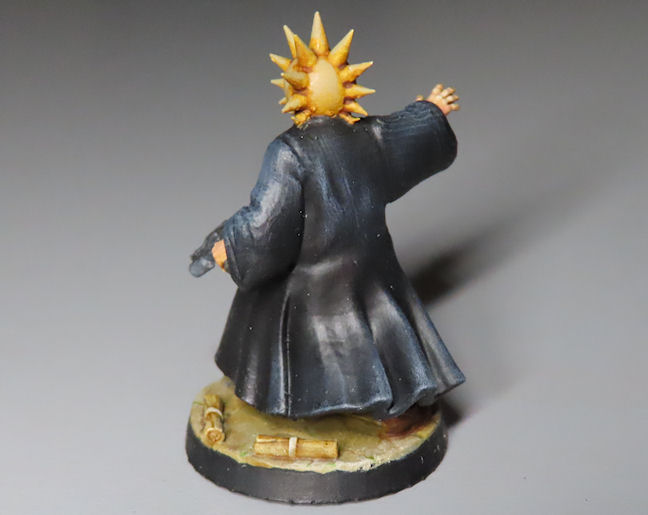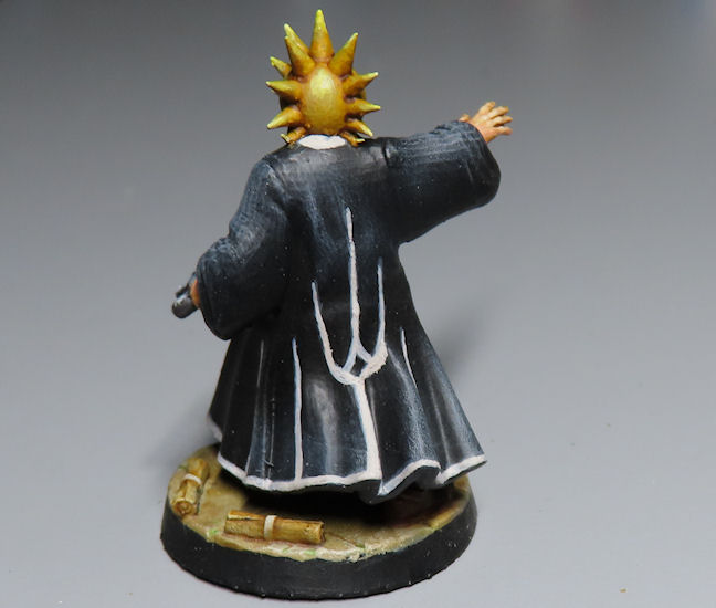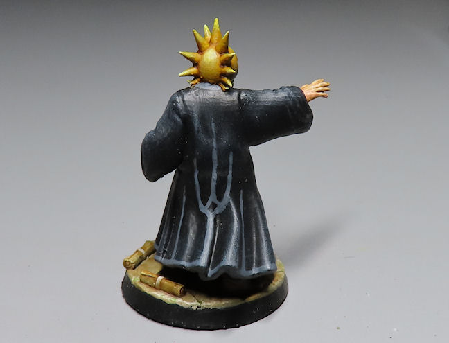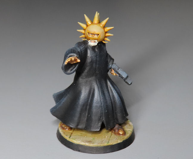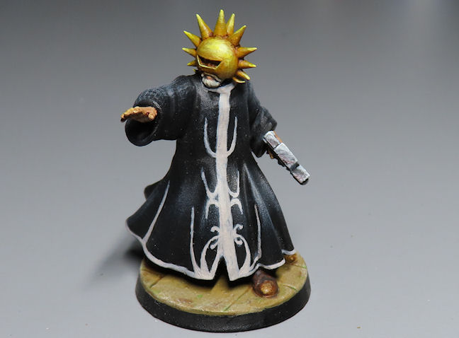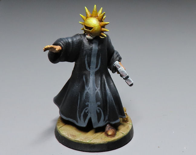 Voici le début de mise en couleur du casque, du visage et du flingue. Et un peu de lumière dans le noir du vêtement.