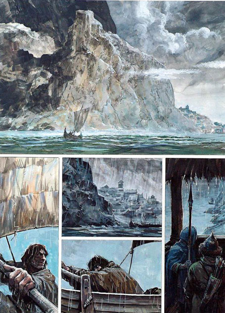 Comme nous, Thorgal voit devant lui une côte découpée en petits fjords. Droit devant lui, à environ mille mètres, se dresse un petit village portuaire entouré de collines. Quatre à cinq barques mouillent à l’embarcadère. On se dit, tout comme lui, qu’il serait bien prudent qu’il s’arrête là pour laisser passer l’orage et, pourquoi pas, en profiter pour demander si le drakkar qu’il poursuit n’est pas passé par là récemment.