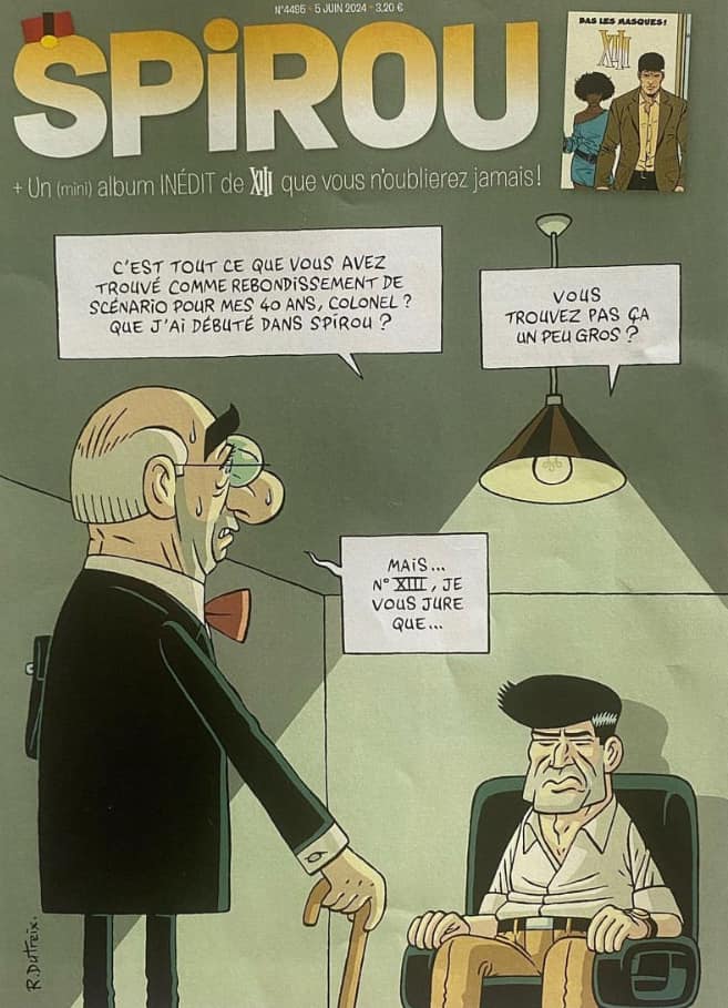 Il s’agit du mini-album de XIII publié l’année dernière dans le journal Spirou à l’occasion des 40 ans de XIII. La surprise, c’est que cette parodie est scénarisée pr Jean Van Hamme lui-même, accompagné par Philippe Xavier au dessin.