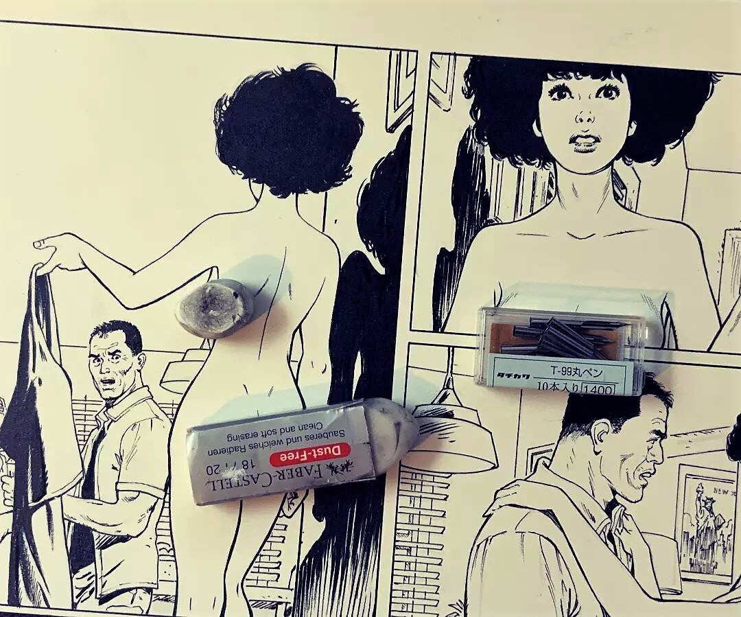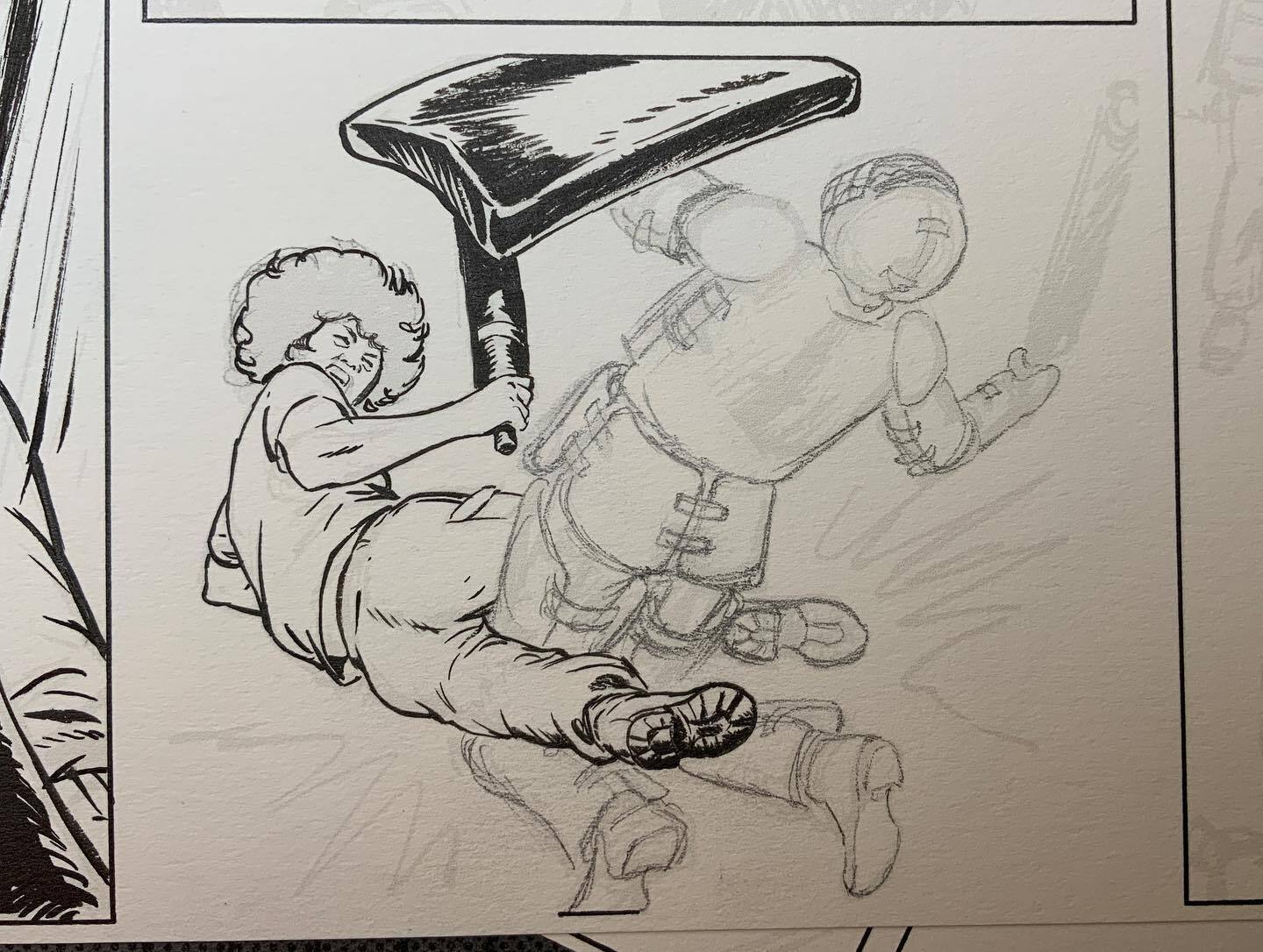 Contrairement à ce qu’on croit, faire des crayonnés numériquement, ça permet d’aller au fond des choses et même de zoomer pour ajuster son dessin au millimètre près. C’est d’un confort inégalé. Et quand l’encrage de ma page est fini, je n’ai pas à gommer non plus. Avant quand on gommait une planche finie, ça enlevait aussi un peu d’encre qui devenait alors plus grise que noire. Il faut savoir que le trait fait à la plume sur papier résiste mieux au gommage. Par contre, quand c’est fait au pinceau, c’est un trait léger et donc tu finis parfois par devoir réencrer par-dessus ton trait qui a été gommé. C’est pénible…