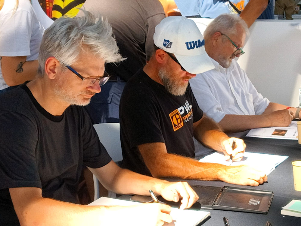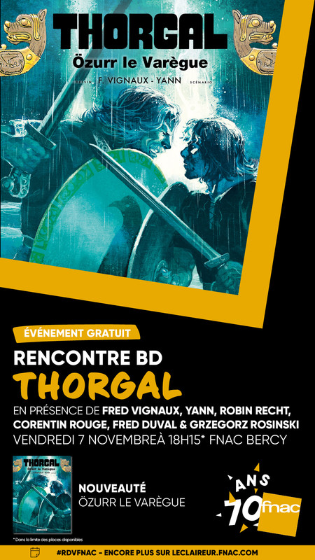 Plusieurs auteurs de Thorgal et Thorgal Saga étaient présents au festival d’Angoulême cette année. Notre envoyé spécial Loïc, fidèle lecteur et connaisseur de la série, a bien voulu que nous l’accompagnions dans ce moment de rencontre et de partage. En images, bien sûr ! Comme toujours à Angoulême, le stand de l’éditeur est accueillant et très visité. Même de loin, on voit aussi qu’une star s’est invitée sur le salon ! Oui, vraiment, on ne peut pas passer à côté. Dans les rayonnages aussi, Thorgal et « Wendigo » sont à l’honneur, avec « Mille yeux » bien sûr, et les autres albums de la série. L’édition augmentée est facile à trouver là-bas ! Loïc a le plaisir de repartir avec le tiré à part, le marque-page et le sous-verre réalisés pour l’occasion. La visite est agréable, mais Loïc a aussi pour objectif de tenter de rencontrer les auteurs. Alors, direction l’espace dédicaces ! Trois albums de Thorgal y sont accrochés : « Mille yeux », « Wendigo » et « Adieu Aaricia ». Ça paraît prometteur ! Les sésames sont en main : le bel album pour occuper l’attente, et le précieux ticket pour la dédicace. Ils sont là ! De gauche à droite, Corentin Rouge (dessinateur de « Wendigo »), Fred Duval (scénariste de « Wendigo »), Robin Recht (dessinateur de « Adieu Aaricia ») et Fred Vignaux (dessinateur de « Mille yeux »). Crayon à la main, les auteurs de Thorgal rencontrent leur public avec bonne humeur. Double dédicace dans « Wendigo », merci Fred et Corentin ! Et à l’année prochaine…