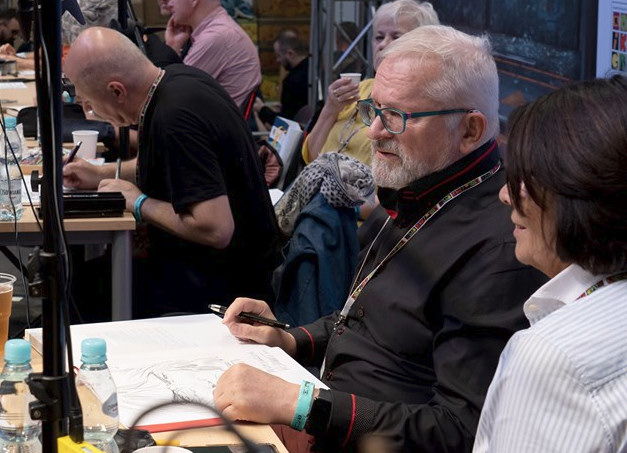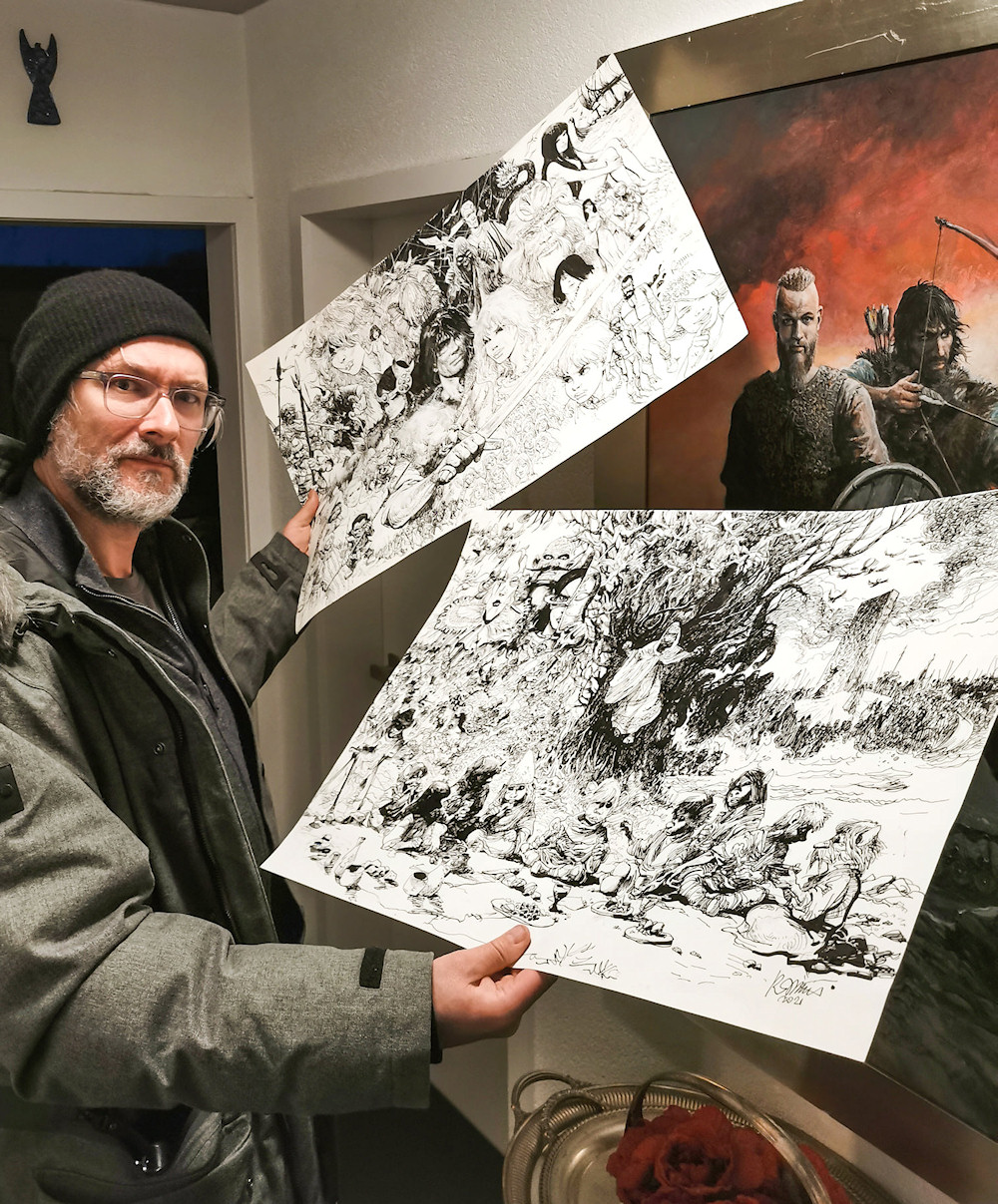 Vous le savez, Grzegorz Rosinski n’est plus le dessinateur des albums de Thorgal. Mais notre dessinateur préféré n’en a pas fini avec ce personnage et son univers. Ces derniers mois, en dehors des couvertures qu’il continue à peindre pour les nouveaux albums, Grzegorz a également ressorti les crayons pour réaliser de magnifiques dessins encrés « à l’ancienne », c’est à dire comme dans les albums de l’époque Van Hamme. Et là, si je vous dis dessin encré, Grzegorz Rosinski et Jean Van Hamme, vous avez forcément des étoiles dans les yeux. Parmi les perles réalisées ces temps-ci par l’auteur, il y en a de nouvelles, présentées il y a quelques jours par Piotr Rosinski, en visite chez son père. Deux magnifiques dessins, au trait, à l’encre, beaux et détaillés, immenses. Alors on va commencer par le dessin du bas, si vous le voulez bien, avec les personnages du mythique « Grand pouvoir du Chninkel » (avec sujet dédié ICI sur le forum). On retrouve dans la partie haute les personnages et scènes marquants de l’album, et en bas une réinvention chninkelienne de la cène de Léonard de Vinci. C’est juste trop beau. Évidemment vous êtes déjà sous le charme, mais vous avez surtout trop trop envie de profiter de l’autre dessin. Que voici. Thorgal, Aaricia, Jolan, Louve, Slive, la gardienne, Gandalf, Kriss, Jadawin, Swanée et une foule d’autres… Qu’est-ce que Thorgal a l’air beau, au milieu… Une image de rêve. Grand merci à Piotr pour ce partage, et surtout à Grzegorz qui continue à nous faire ce genre d’incroyables cadeaux (alors que, comme certains d’entre vous doivent le savoir, il approche des 1000 ans… ou 80, je ne sais plus). Ah, pour finir, un dernier cadeau juste pour le plaisir.
