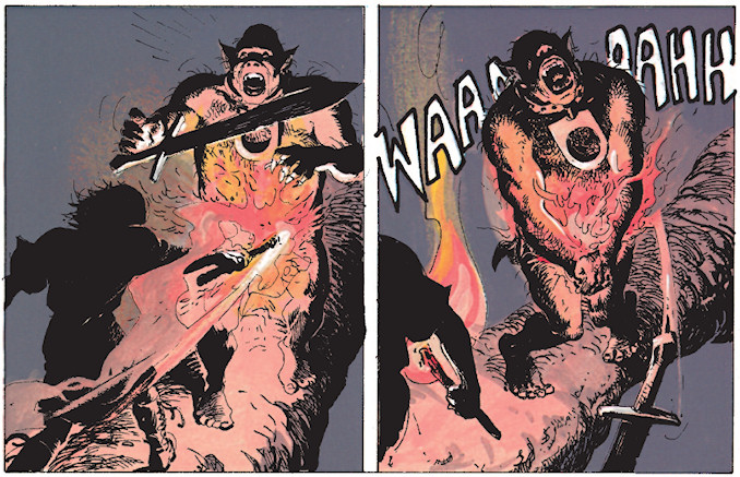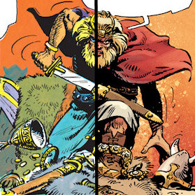 Que diriez-vous de nous replonger dans « La chute de Brek Zarith », non pas pour en apprécier l’esthétique particulière ou pour y découvrir le premier rôle du petit Jolan, mais pour évoquer l’humour sombre et dérangeant qui est saupoudré par le fabuleux duo Van Hamme – Rosinski. « La chute de Brek Zarith » est une œuvre à part dans la série. L’album est peuplé de personnages présumés extravagants, se comportant de façon absurde, mais se révélant au fond profondément normaux. Leur univers est grotesque, alors qu’eux ne le sont pas. Dans cette histoire l’humour est présent notamment sous forme vestimentaire. Les aristocrates de la cour de Brek Zarith sont maquillés et vêtus de façon saugrenue — du moins selon nos critères — histoire de souligner leur soumission à une haute société décadente, orchestrée par un maître qui s’en délecte. Filles nues, corps peints, têtes d’animaux. Ce carnaval des riches est tout autant risible qu’inquiétant. Shardar se prête aussi au jeu du déguisement mais tout en prévoyant le nécessaire pour rendre son costume aussi laid que mortel. Le gars en face, là, quand même, il se fait tuer par une licorne qui fait clic. Notre Shardar, justement, n’est pas avare de bons mots, notamment ici lorsqu’il exécute son petit maître d’œuvre. En fait, l’album entier est empreint de dramaturgie burlesque. On tue en riant, on meurt par maladresse, hasard, bêtise ou lâcheté, pour le plaisir du roi, sous le regard de ses pairs. Au sein de l’immense armada viking, Wargan est ainsi le premier adversaire à mourir, brûlé vif alors qu’il tente de sauver la troupe. Comme si un type là-haut dans la montagne avait pris soin de viser le petit grand-père qui s’agitait sur un des bateaux, en criant « preums ! » à ses voisins d’artillerie. La scène n’est pas anecdotique, on y perd l’un des personnages principaux du tome précédent. L’un des premiers chocs visuels et psychologiques d’un album qui n’en manquera pas. On continue ? Lorsqu’il lutte pour sa vie en s’accrochant à un bout de bois, le fier roi Jorund ne vous fait pas penser à quelqu’un d’autre ? La suite, pour Jorund, n’est pas plus glorieuse, et je préfère ne pas trop regarder la scène de sa fin, elle m’a bien trop fait cauchemarder lorsque j’étais enfant. Son sort abominable, réparti sur trois planches, est tout aussi grotesque que les fêtes bariolées de Shardar : pour protéger son trésor, le maître de Brek Zarith a imaginé et fait construire un système capable de faire disparaître à jamais sa fortune. Une sorte de « nananère, tu ne l’auras pas non plus », comme le caprice d’un enfant fou. Et on en oublierait presque notre Thorgal ! Mais vous allez voir qu’il s’en sort bien dans la blaguounette, sans le vouloir évidemment. Vous êtes-vous déjà attardés sur les scènes d’action de l’album ? Notre Thorgal croise tout d’abord Gilbert, un habitué des dîners de cons. Pok. Il échange ensuite rapidement avec Michel, qui s’assoit généralement juste en face de Gilbert dans les soirées. Notre héros multiplie ensuite les acrobaties, tout en se faisant assommer par sa belle épouse, après avoir traversé la moitié du monde pour la retrouver. Sa seule faille, finalement, dans un album qu’il domine de bout en bout. Et notre Thorgal, on ne peut pas le quitter sans évoquer l’un de ses derniers combats dans les souterrains de Brek Zarith, face à un géant mutique et violent, qu’il foudroie en un instant… d’un coup dans les roubignoles. Aïe. Fatal.
