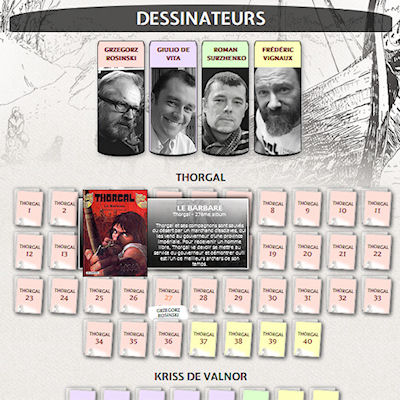 35 albums de Thorgal, et bientôt 36. 20 albums des Mondes de Thorgal… Il est temps de faire le point ! Depuis le départ de Jean Van Hamme, différents auteurs ont rejoint conjointement ou tour à tour l’aventure, et plusieurs séries se sont développées en parallèle des albums de Thorgal. Il n’est peut-être pas toujours simple de s’y retrouver. S’il s’agit de découvrir les différentes séries des Mondes de Thorgal, vous pouvez suivre les liens de la section Univers du site. Thorgal – Kriss de Valnor – Louve – La jeunesse de Thorgal Si vous recherchez la liste chronologique de parution des albums, la section Albums et son lien Nouveautés sont parfaits pour cela. La nouvelle section du site, Eclairages, a pour ambition de proposer des outils de décryptage, des infos inédites ou insolites, des analyses de la série. Le mois dernier, vous avez pu y visiter l’atelier de Grzegorz Rosinski. En mai, on continue d’y découvrir les auteurs de Thorgal. Scénaristes, dessinateurs, coloristes, treize auteurs ont participé aux albums ces dernières années. La toute nouvelle page, l’Auteurothèque, vous présente leurs travaux et peut vous aider à savoir qui fait quoi, combien d’albums ont été réalisés par chacun d’entre eux, dans quelles séries ils ont exprimé leur talent. Les auteurs sont listés dans l’Auteurothèque et leurs albums y sont présentés sous forme de tuiles colorées, qui vous livrent leurs secrets quand vous passez la souris ou cliquez dessus. Comme vous le voyez, c’est plutôt simple en ce qui concerne les dessinateurs, ça se complique un peu avec les scénaristes ou les coloristes. Allez la visiter, deux minutes suffisent pour comprendre et connaître toute la bibliographie thorgalienne !