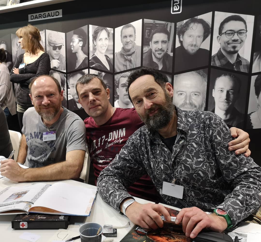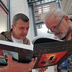 Grzegorz Rosinski et Roman Surzhenko étaient du côté de Varsovie, le week-end dernier, côte à côte pour parler de Thorgal, rencontrer le public polonais et passer un peu de temps ensemble. Grzegorz présentait notamment une nouvelle édition luxueuse de l’une de ses œuvres les plus célèbres, « Le grand pouvoir du Chninkel ». Il était d’ailleurs entouré par certains des personnages principaux de son album. Une exposition de planches, et une invitée spéciale, accompagnaient l’auteur. L’occasion, pour l’auteur, de recevoir un nouveau prix.   De son côté, Roman dédicaçait beaucoup, comme à son habitude. On ne le voit pas sur ces images, mais il y avait beaucoup de monde ! Vous reconnaîtrez sûrement ci-dessous l’un des jumeaux qui protégeait les anneaux de Freyr, dans le tout premier album de la série. Thorgal s’esquisse… Roman ne se sépare plus du tee-shirt reçu l’an dernier au cours de la Convention Thorgal, à Paris. Roman sourit ! Regardez, on a une preuve. Les deux garçons ont fini par se rejoindre, pour dédicacer mais aussi pour feuilleter avec gourmandise les belles pages du Chninkel. Pour cette dernière photo, Grzegorz avait enfin retrouvé l’une des chemises dont il a le secret. Il était temps. Vous pouvez l’apercevoir au dos de l’album, les deux couvertures originelles du Chninkel se côtoient sur cette édition. Si vous voulez savoir et comprendre pourquoi un album peut avoir deux couvertures originelles, et non une seule, leur histoire vous est racontée ici.