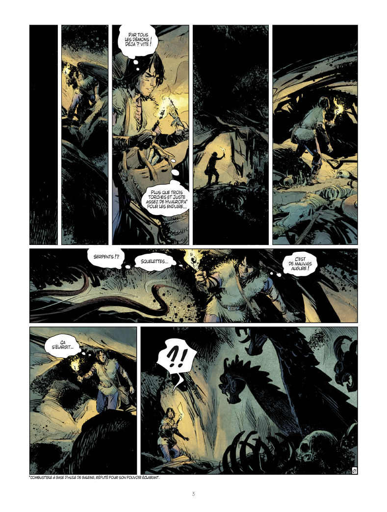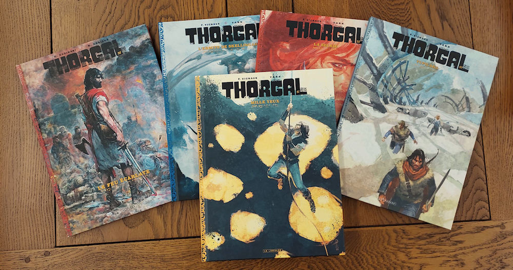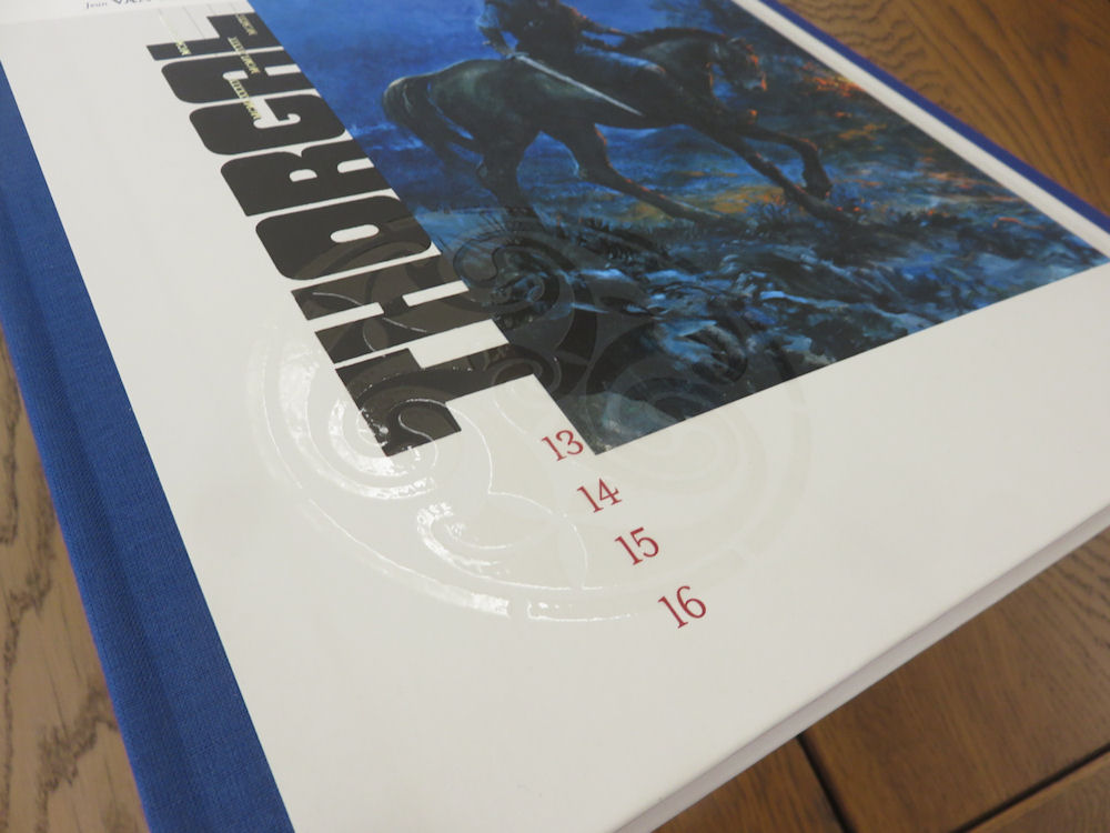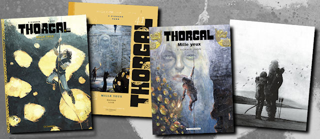 Les collectionneurs, les amoureux des beaux livres ou les curieux peuvent profiter d’éditions prestigieuses, aux finitions encore supérieures à celles de l’édition classique. Depuis quelques années, la plupart des albums de Thorgal ont pu être proposés dans une édition luxueuse, limitée, à un tarif raisonnable. Pour ce 41ème album, les partenaire de cette opération sont les Espaces Culturels Leclerc. Vous ne trouverez cette édition spéciale que chez eux (21€50, uniquement chez Leclerc) ! Voici les tomes qui font partie de ce qu’on peut désormais définir comme une collection. Et donc, le nouvel album ! Comme vous le voyez, le format et les finitions de ces tomes presque successifs sont sensiblement les mêmes. On retrouve donc un visuel de couverture exclusif, différent de celui de l’édition classique, une finition mate et une maquette épurée. Une collection, mais oui ! Les tomes 36 et 39 n’en font pas partie. Voici donc la couverture de l’édition prestige de « Mille yeux ». Réalisée par Fred Vignaux, elle propose un Thorgal en pleine action, cherchant à remonter une corde sous le « regard » d’une roche étrange sertie d’éclats lumineux. L’album est plus grand que l’édition classique. Sa finition mate retient l’œil différemment. Derrière l’album, on retrouve le visuel de l’édition traditionnelle du Lombard. L’aspect sobre fonctionne plutôt bien. On ouvre ? Et on retrouve la page de titre spécifique de cette collection prestige, avec sa maquette élégante. 1500 exemplaires seulement, il ne faudra pas traîner pour se le procurer… Si vous vous demandez qui est Gaétan, il s’agit de Gaétan Georges, le coloriste de Thorgal et de Thorgal Saga ! Le contenu de l’album est identique à celui de l’édition classique — en dehors du cahier graphique dont on vous parle un peu plus bas. Les planches sont donc en couleur, dans un format légèrement plus grand. Quelques millimètres de plus. Le papier est de belle qualité, plus épais, très agréable au toucher. On retrouve donc l’histoire de « Mille yeux » avec entre autres… Ben si tu veux savoir, il va falloir le lire. C’est quand même mieux. Comme vous le voyez, l’image est à peine plus grande que dans l’édition classique (présentée en dessous pour comparaison). Quelques millimètres, il faut le mesurer pour le voir. Par contre, ici, les planches sont imprimées avec une finition satinée qui approfondit les contrastes et les couleurs de façon plutôt agréable. L’expérience de lecture est donc assez différente, avec aussi le plaisir d’un papier plus lourd, plus lisse que d’habitude. Oui je sais, ça ne se voit pas trop sur ces photos. Mais promis, c’est vrai. L’autre atout de cette édition prestige est le cahier graphique de 8 pages qui vient clore la lecture en proposant des images inédites extraites des archives des auteurs. On voyage avec la main de Fred Vignaux, abandonnée sur le papier. Elle glisse, elle tâtonne, elle cherche à faire émerger des personnages, des lieux, des idées. A droite, ce n’est pas un gâteau d’anniversaire. Il n’y a pas de spoiler, l’objet est en couverture de l’album — sans la bougie. La galerie de portraits s’étend, de nouveaux personnages y apparaissent. C’est ici qu’ils sont venus à la vie. Profitons encore un peu de ces images inédites, réservées aux 1500 heureux propriétaire de l’édition Leclerc. L’album offre un dernier cadeau, des travaux préparatoires pour la couverture. Si vous êtes intéressés, ne traînez pas, il serait dommage de devoir le chercher dans quelques temps en occasion à des prix honteux… … Retrouvez cet article, des planches et d’autres informations, dans la fiche de l’album « Mille yeux » !