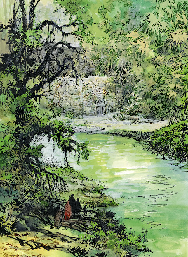 Et voici deux pages lumineuses, éclairées par le soleil. Avec une pointe de science-fiction médiévale, extraite de « La couronne d’Ogotaï ». On peut remarquer que certaines cases presque blanches laissent beaucoup d’espace pour la mise en couleur des fonds.
