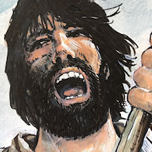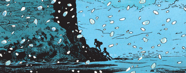 De l’autre côté, on retrouve comme toujours une planche complète, extraite cette fois-ci de l’album « Géants ». Une scène de fuite, dynamique. L’orage nocturne a permis au dessinateur de jouer comme il l’aime avec les ombres et les lumières.