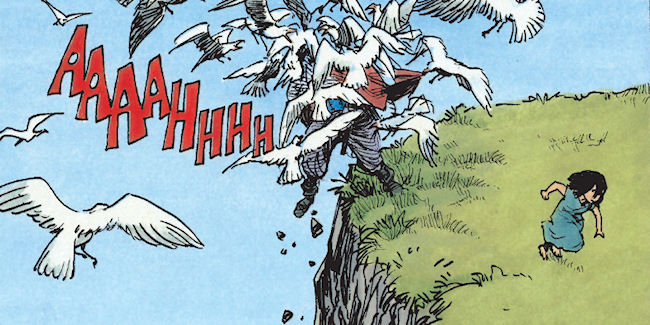 Un matin, un groupe d’hommes débarque dans l’île. Ils ligotent Darek et Jolan. Louve s’enfuit avec son chien. Elle est retrouvée par Thorgal, échappé de sa cage, qui la cache dans les bois avant de partir aider le reste de la famille. Malheureusement, elle est enlevée par un homme affreux, qui l’emmène et menace de la jeter du haut de la falaise. Demandant de l’aide aux oiseaux marins, Louve parvient à se débarrasser de l’homme en le précipitant dans le vide. Elle se jette, enfin, dans les bras de son père.